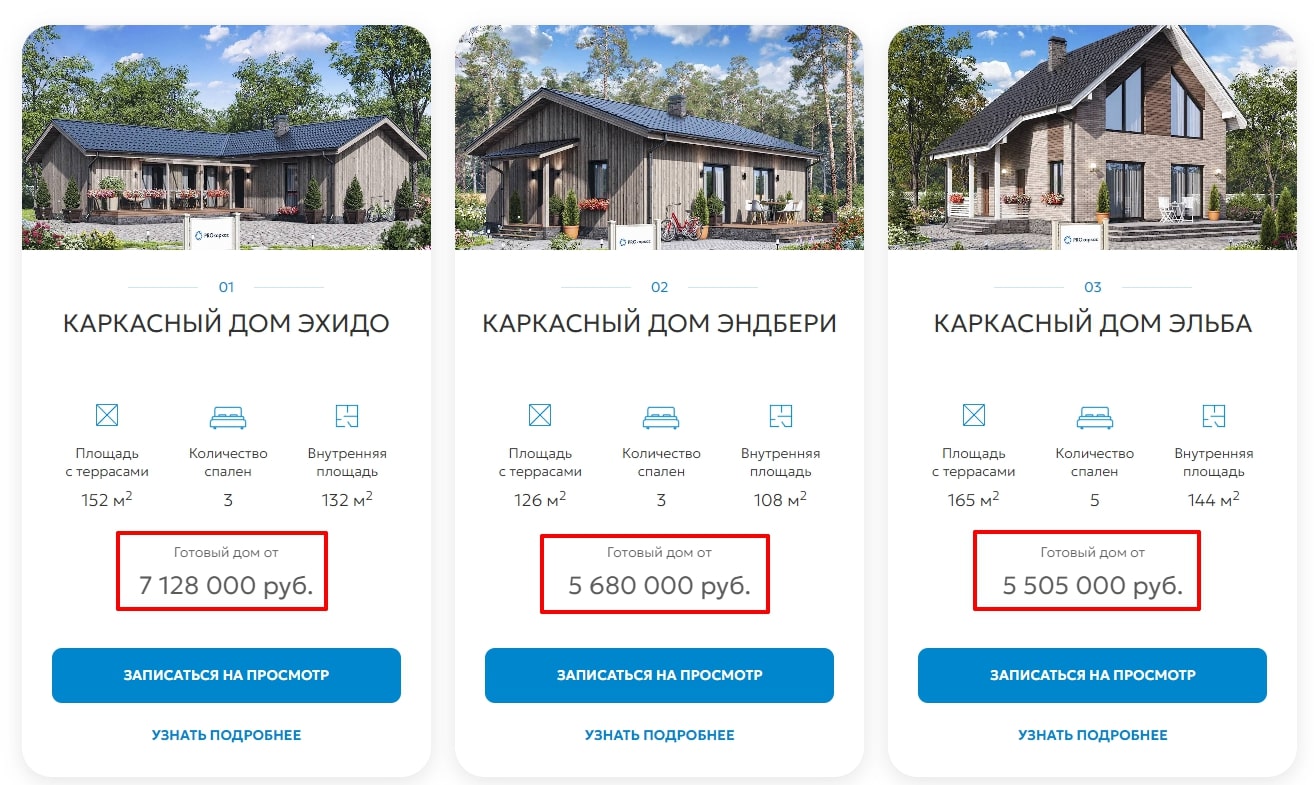 • Добавление цен и информации о проектах: на страницах проектов опубликованы актуальные цены и подробные описания домов.