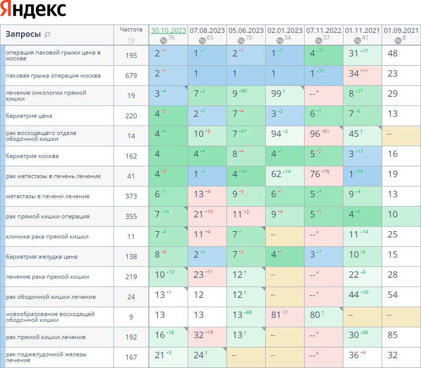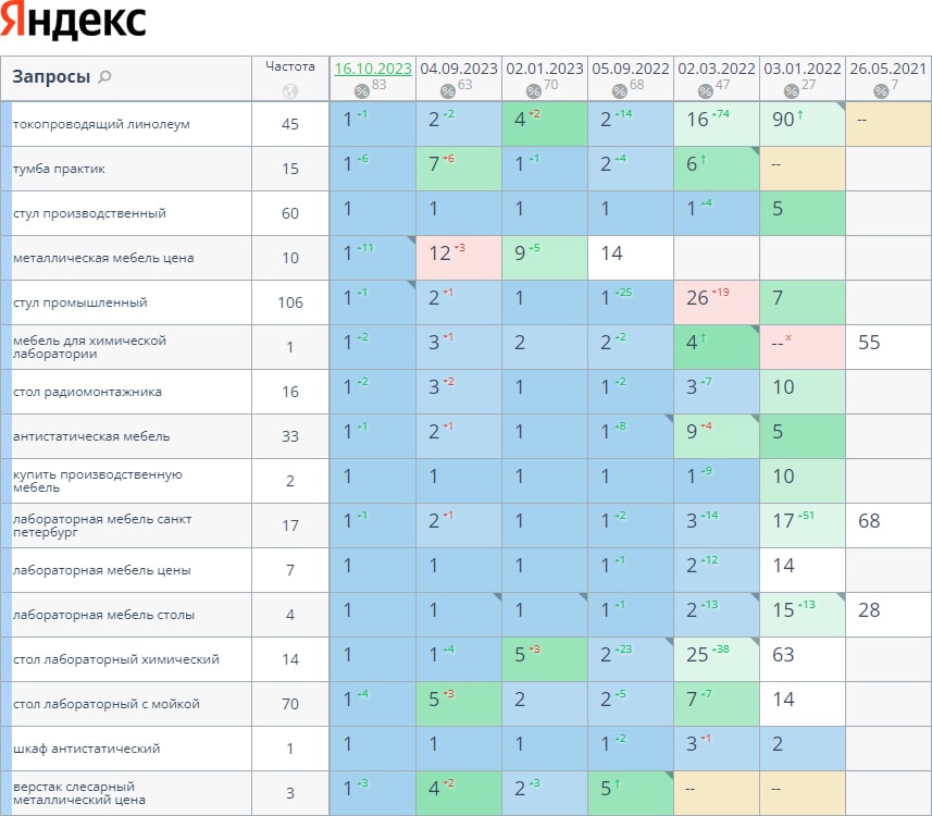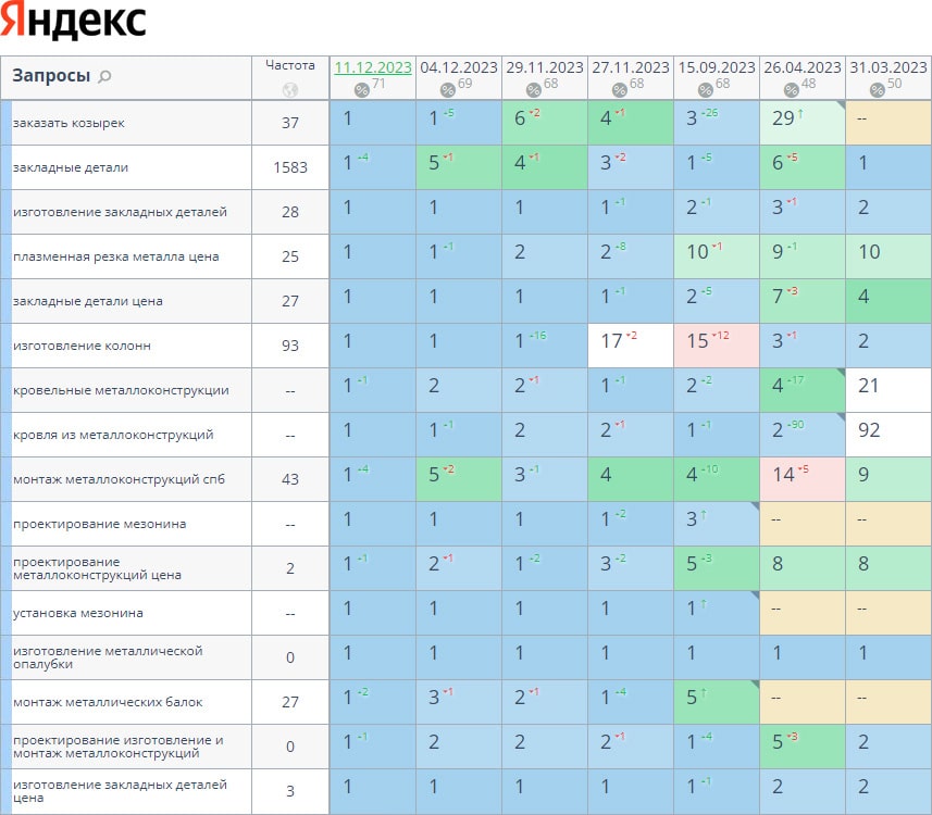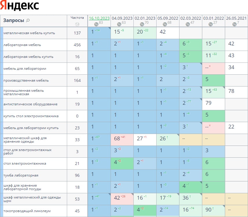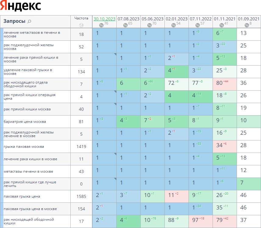 За время работы нам удалось поднять позиции в Яндекс с 18% до 71% в ТОП-10 и с 5% до 44% в ТОП-3.